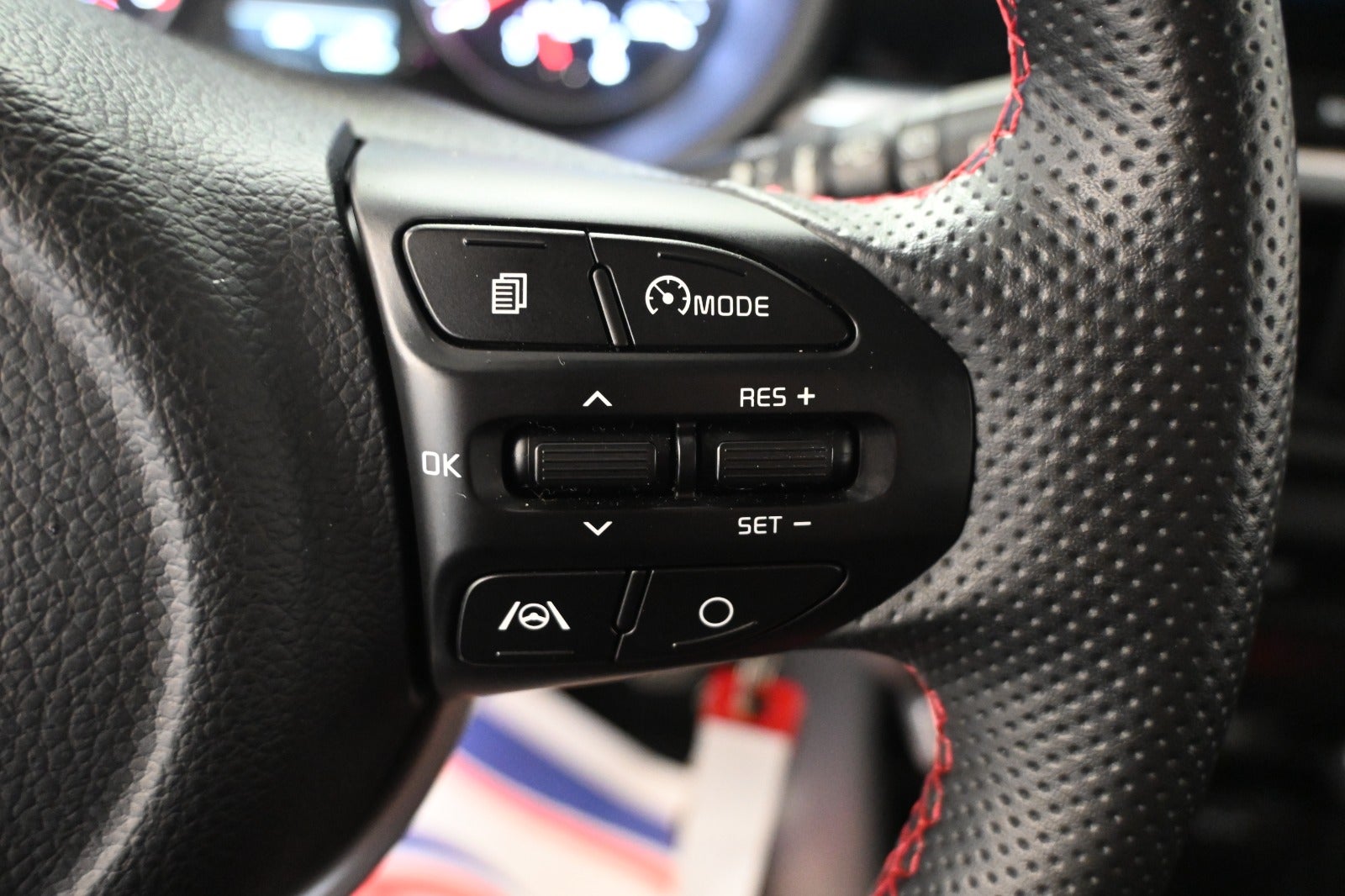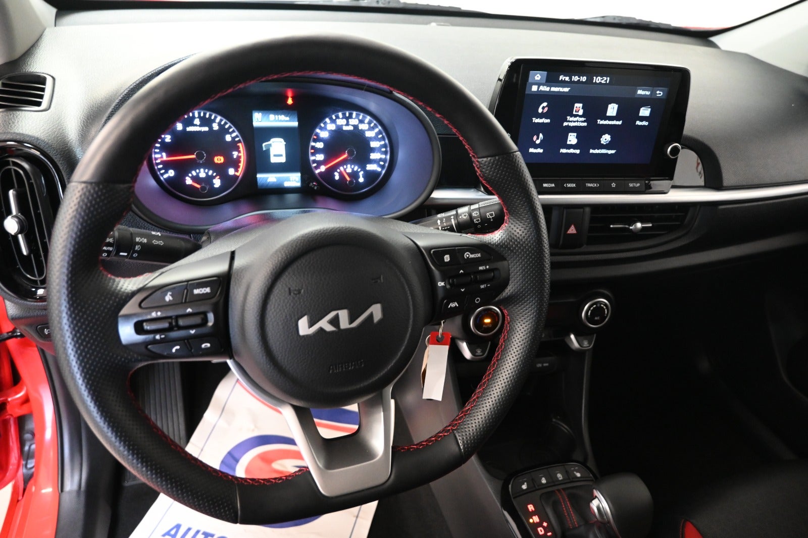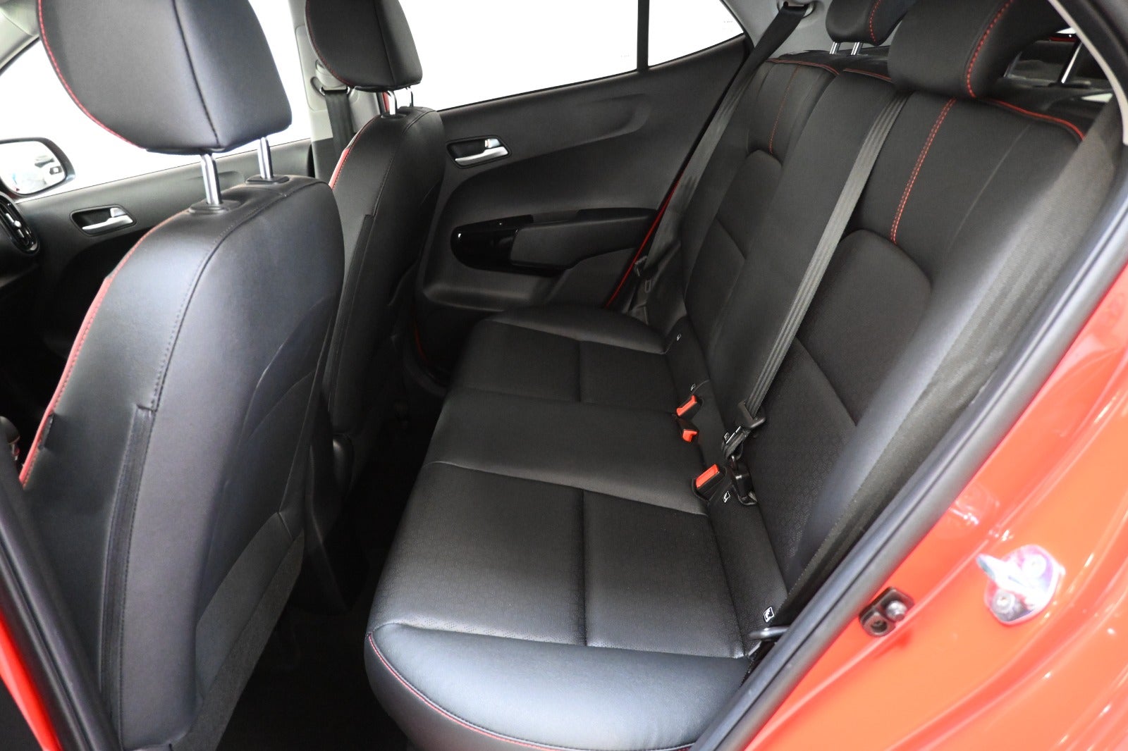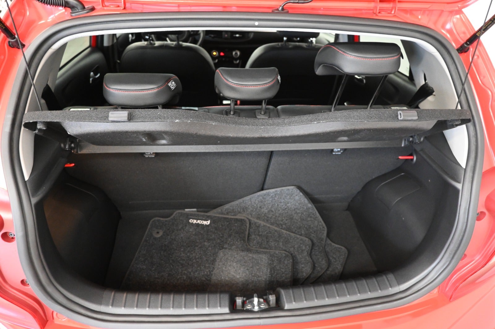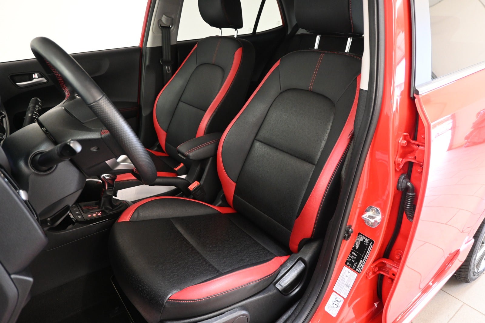 Kørecomputer, bagagerumsdækken, multifunktionsrat, læderrat, komplet sort læderindtræk med røde detaljer, højdejust. førersæde, splitbagsæde, midterarmlæn, kopholder, pianoblanke interiørdetaljer.