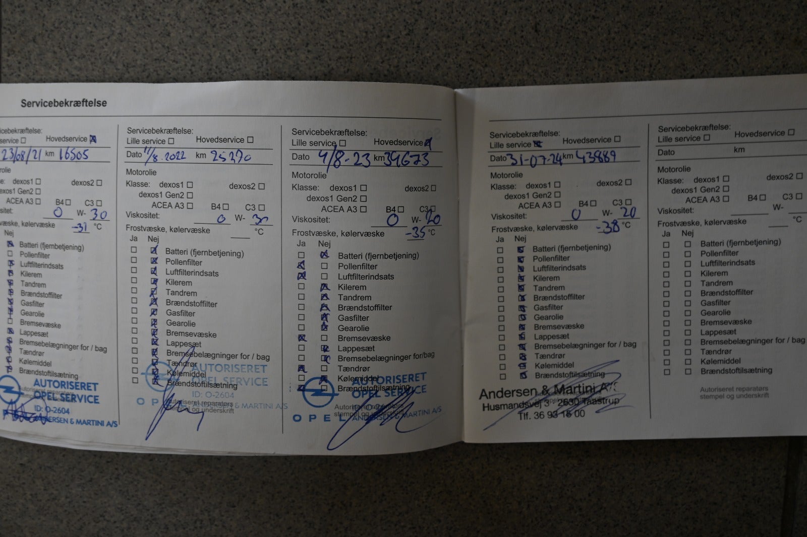 Service udført v. følgende kilometer hos Opel: