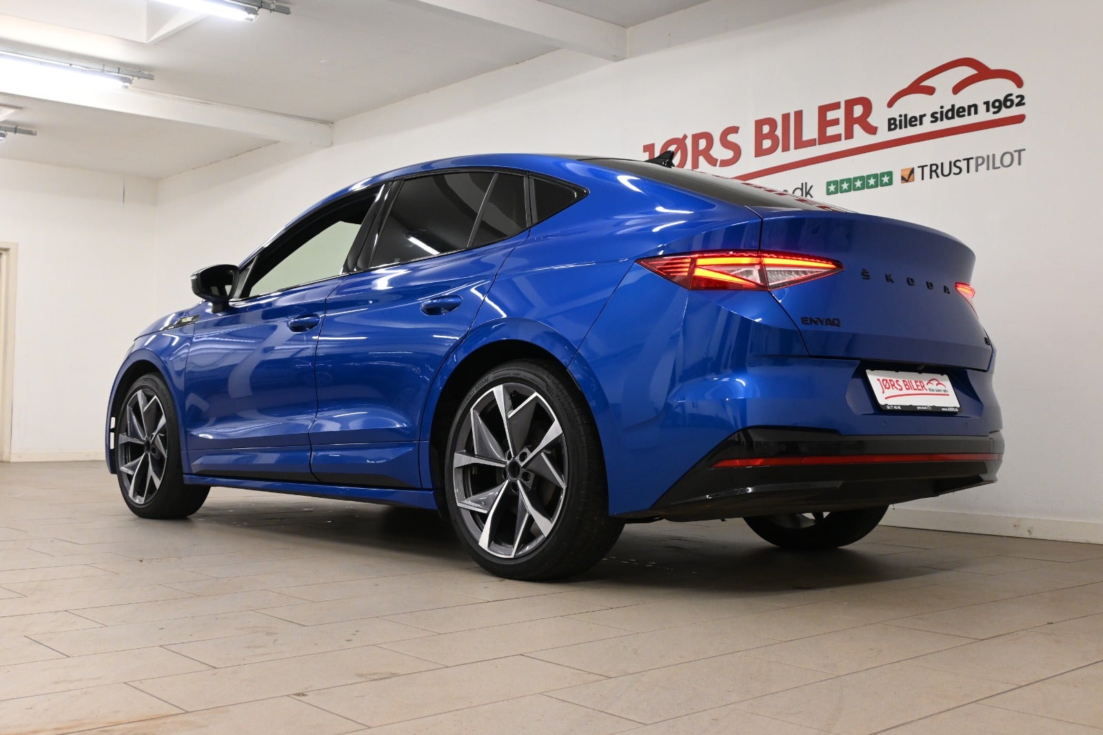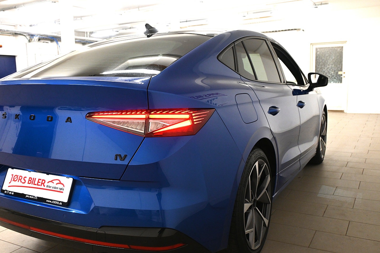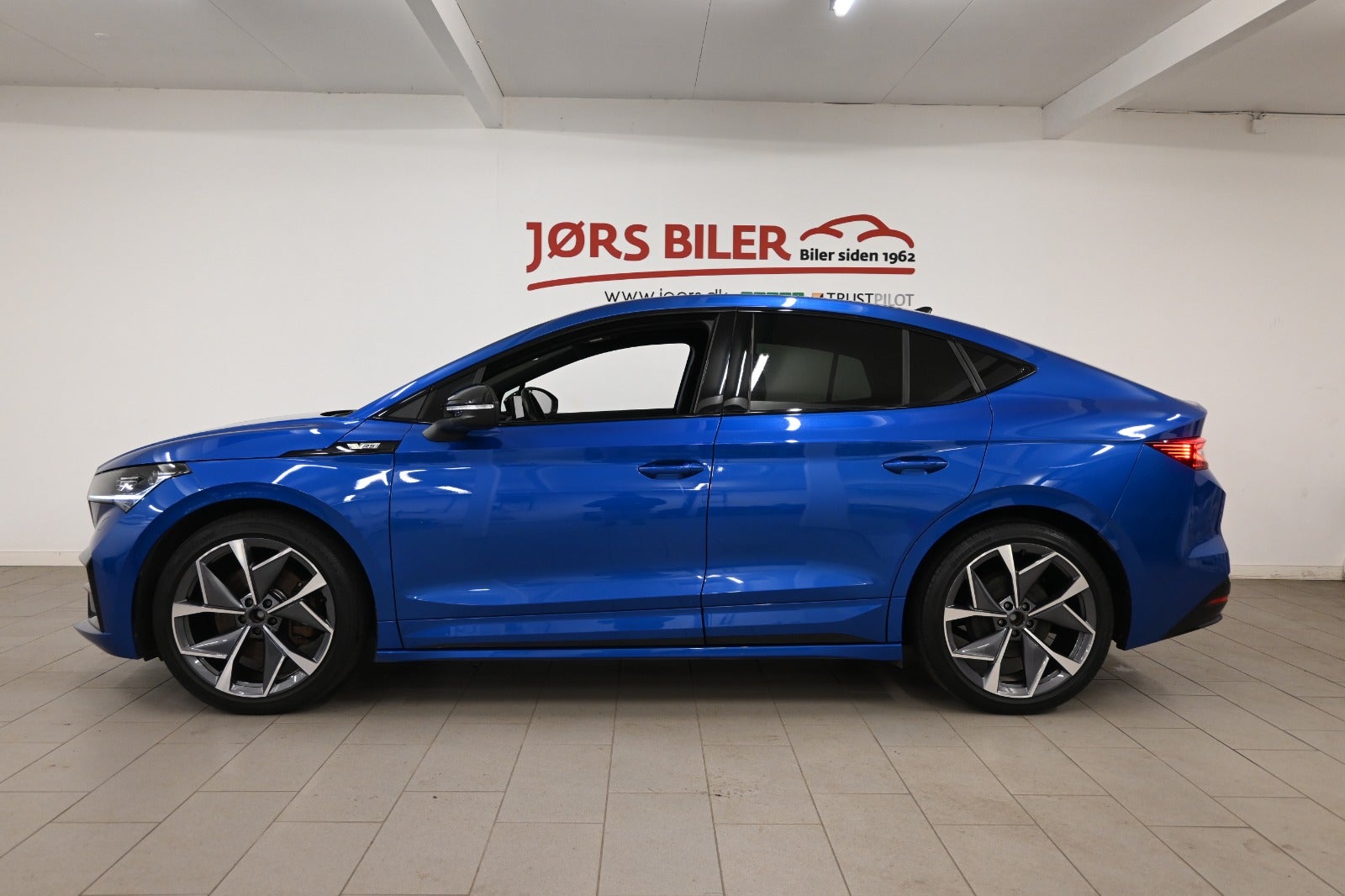 Vi mener denne Enyaq er helt korrekt sammensat i den klassiske metallak "Race Blue" som står virkelig flot i kontrast til RS linjens sorte detaljer & bilens LED lys - og så er bilen i den smukke Coupé version.