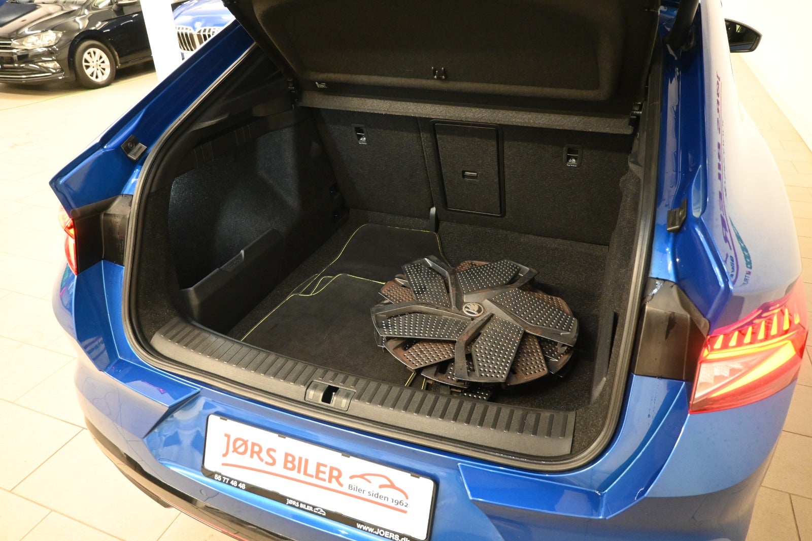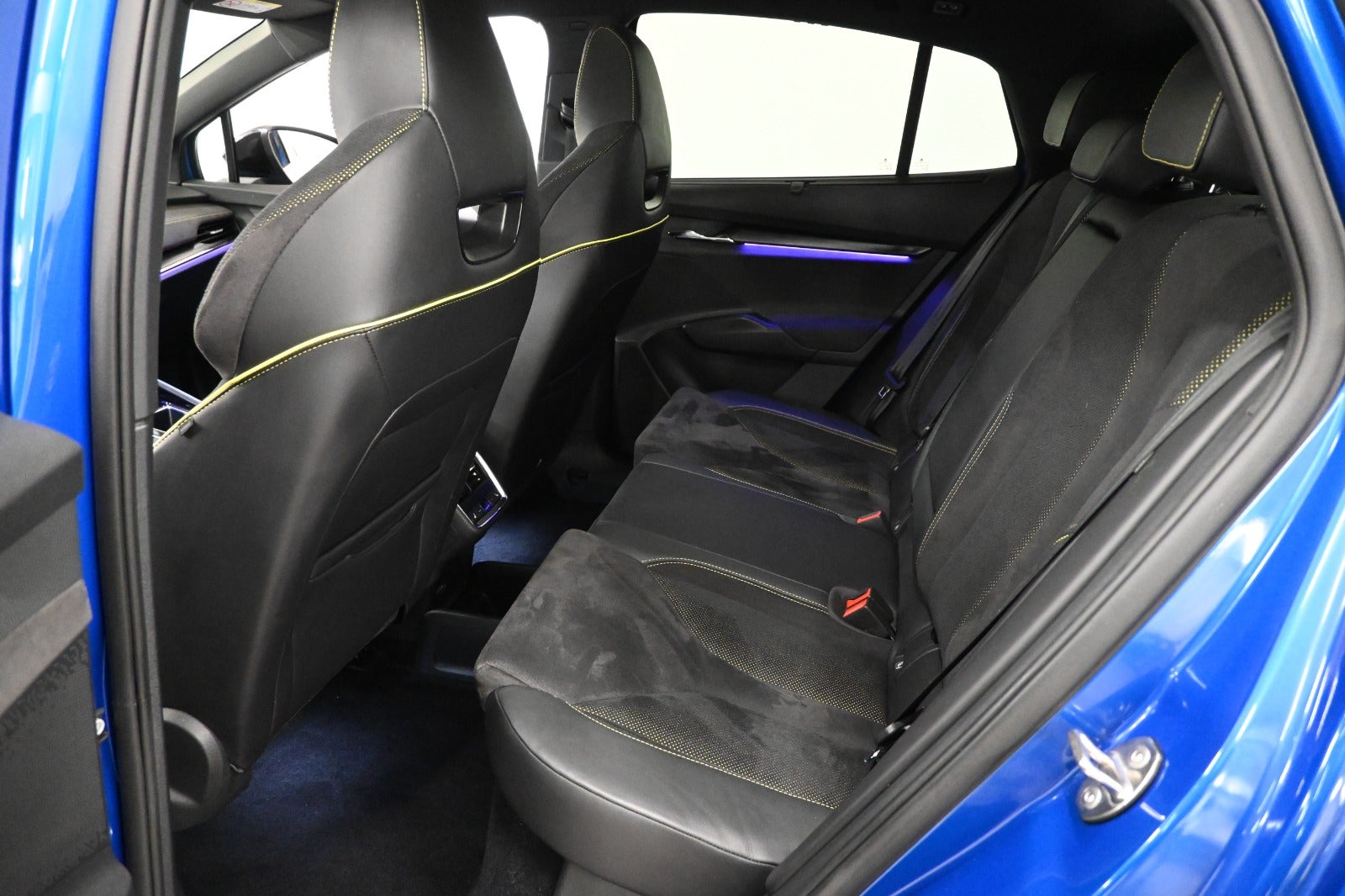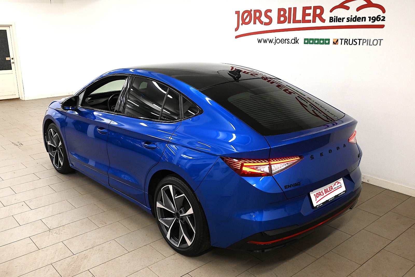 Vi mener denne Enyaq er helt korrekt sammensat i den klassiske metallak "Race Blue" som står virkelig flot i kontrast til RS linjens sorte detaljer & bilens LED lys - og så er bilen i den smukke Coupé version.