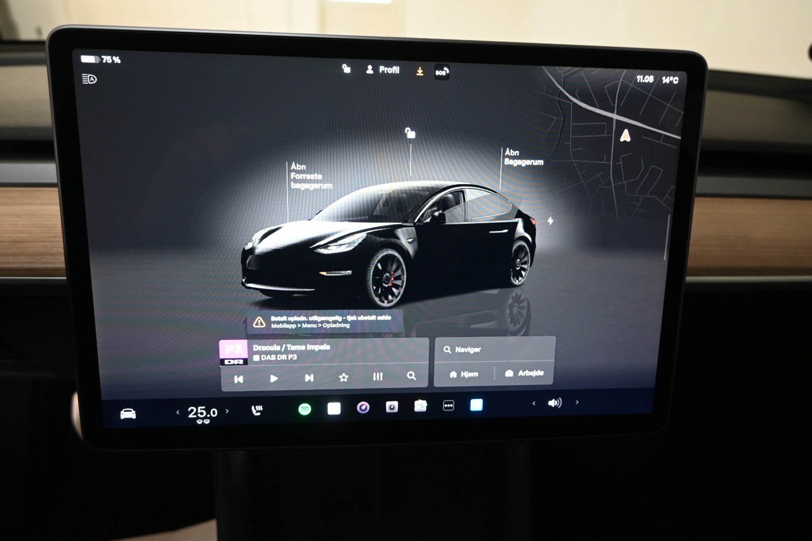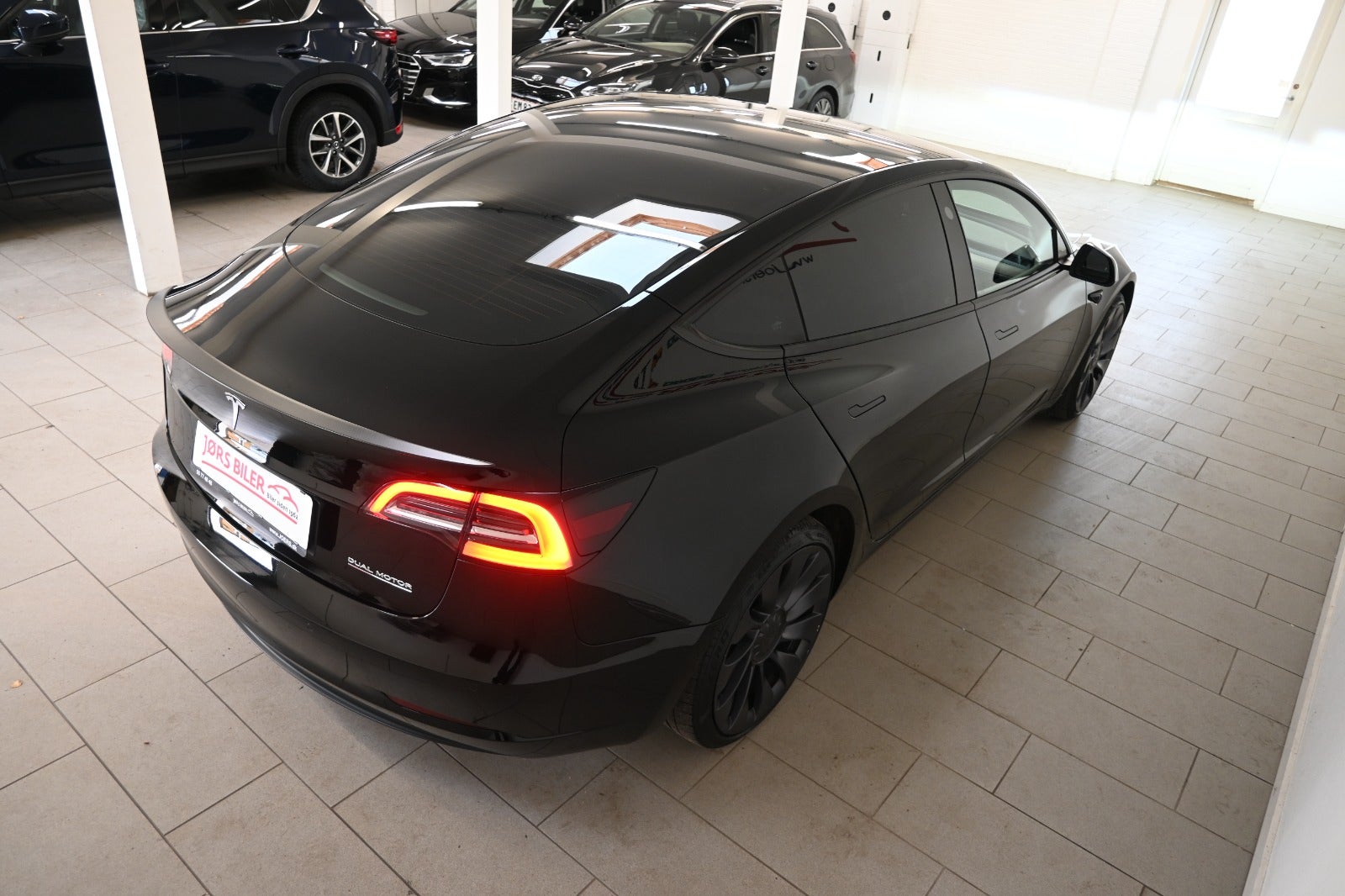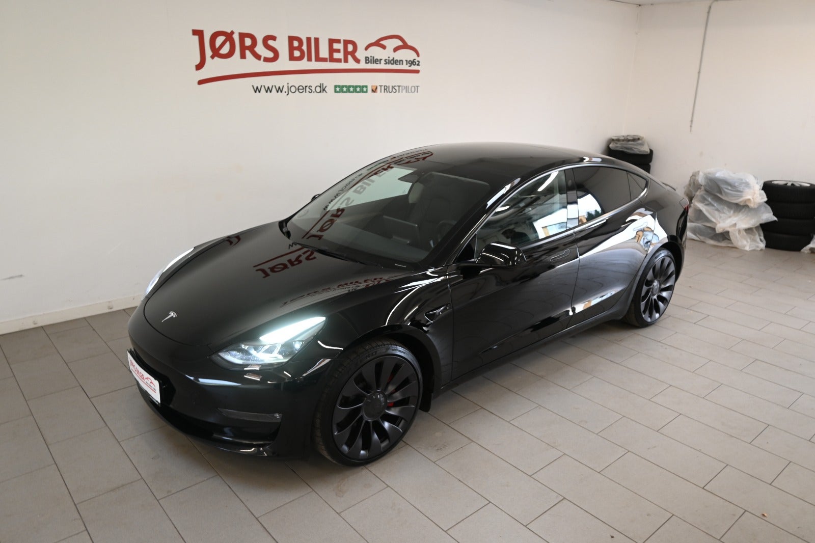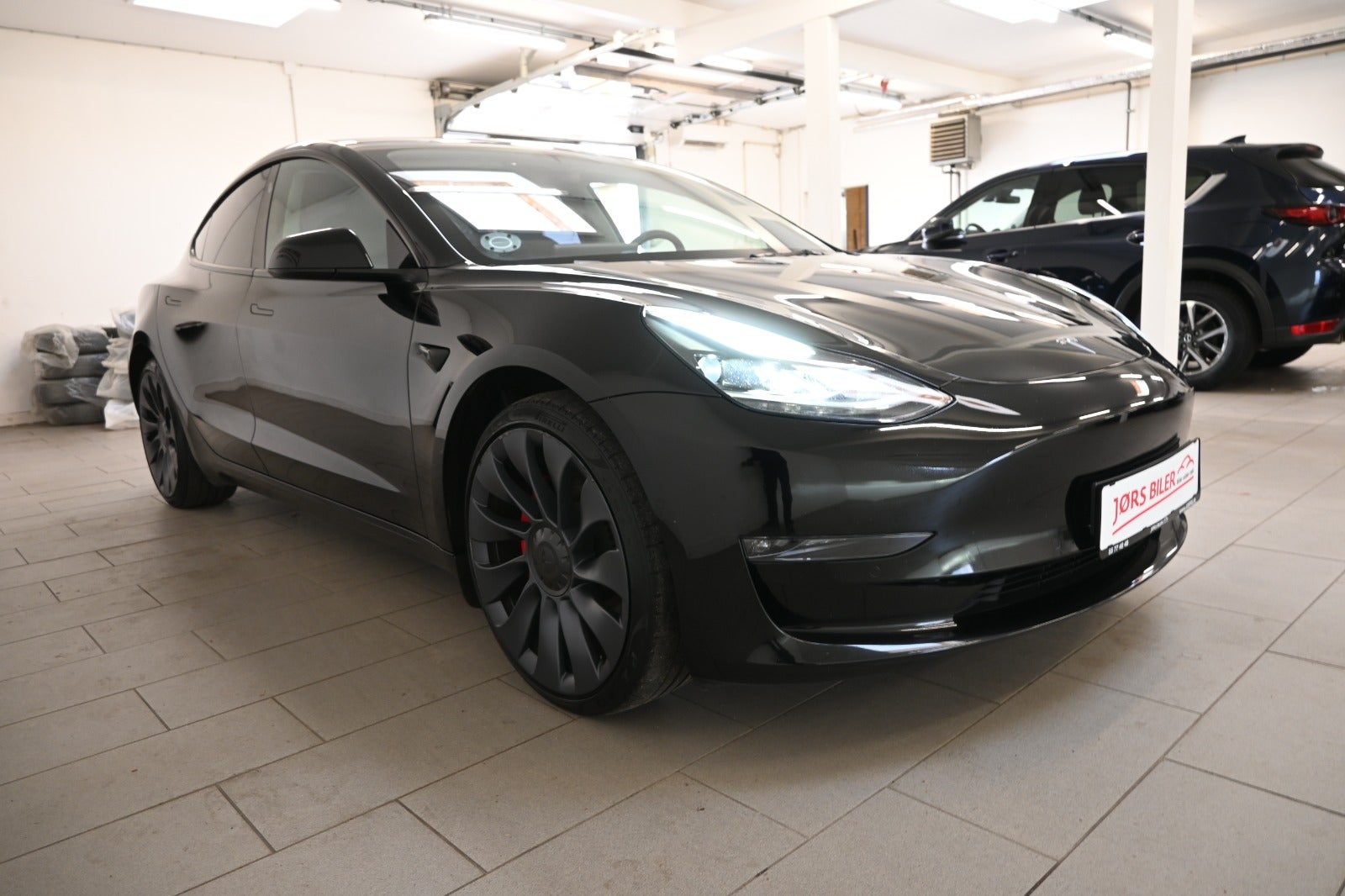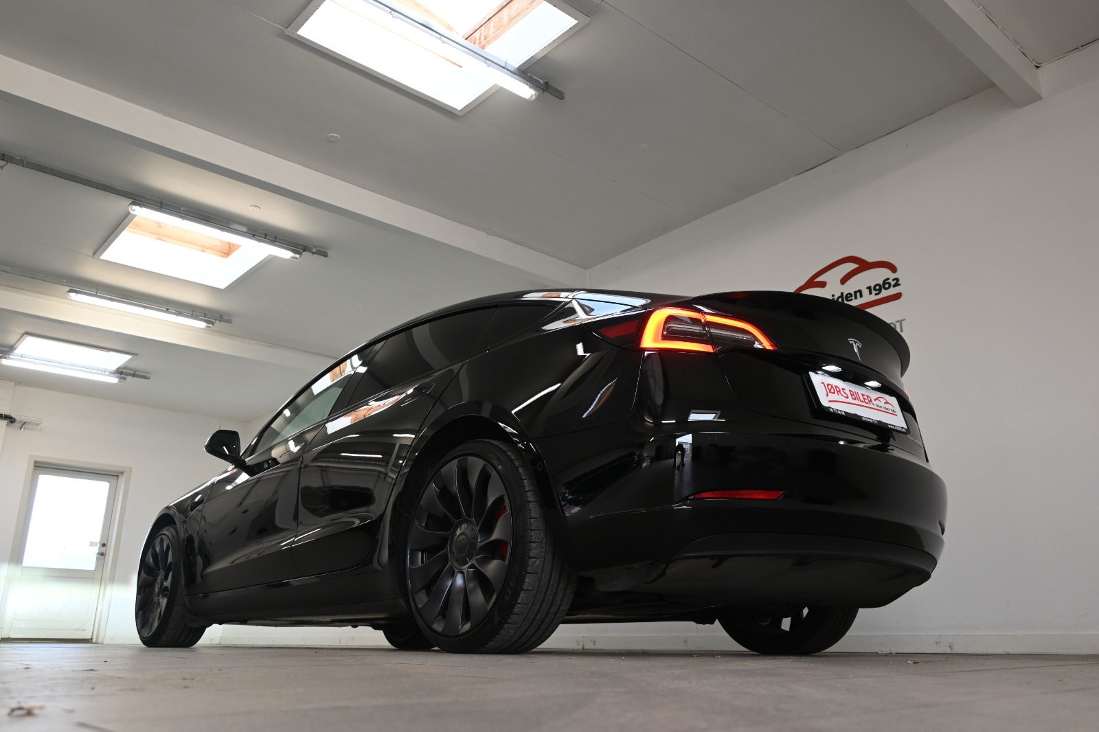 Virkelig lækker Tesla model 3 i den vilde Performance udgave & helt råt sammensat med komplet sort eksteriør kun gennembrudt af bilens røde bremsekaliber & kombineret med sort læderkabine.