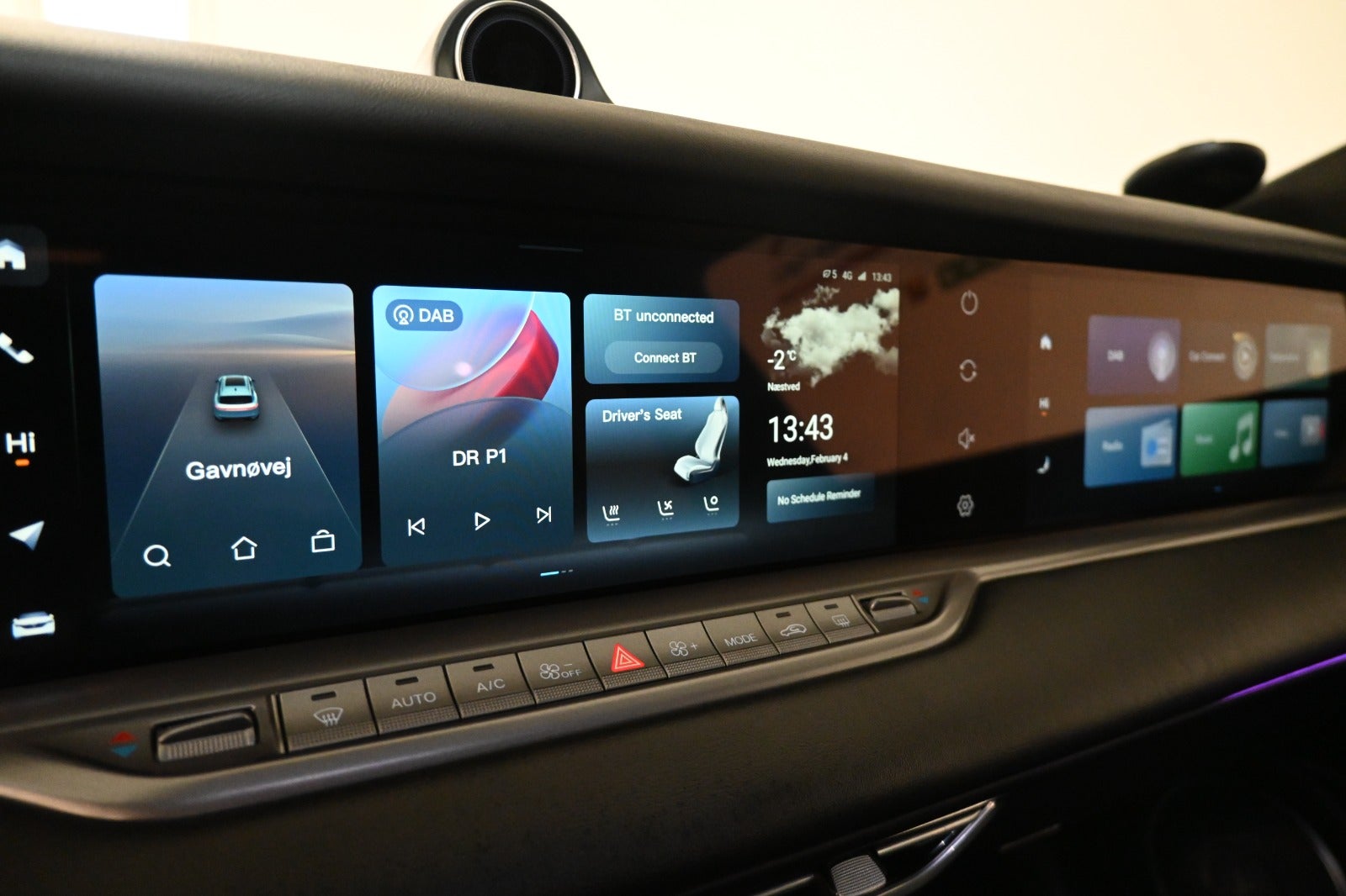 DAB+ radio m. ratbet., org. navigation, hæve/sænke dashboard med 3x touchscreen, håndfrit til mobil, musikstreaming via bluetooth, USB-C tilslutning, Dynaudio premium soundsystem m. aktiv subwoofer.